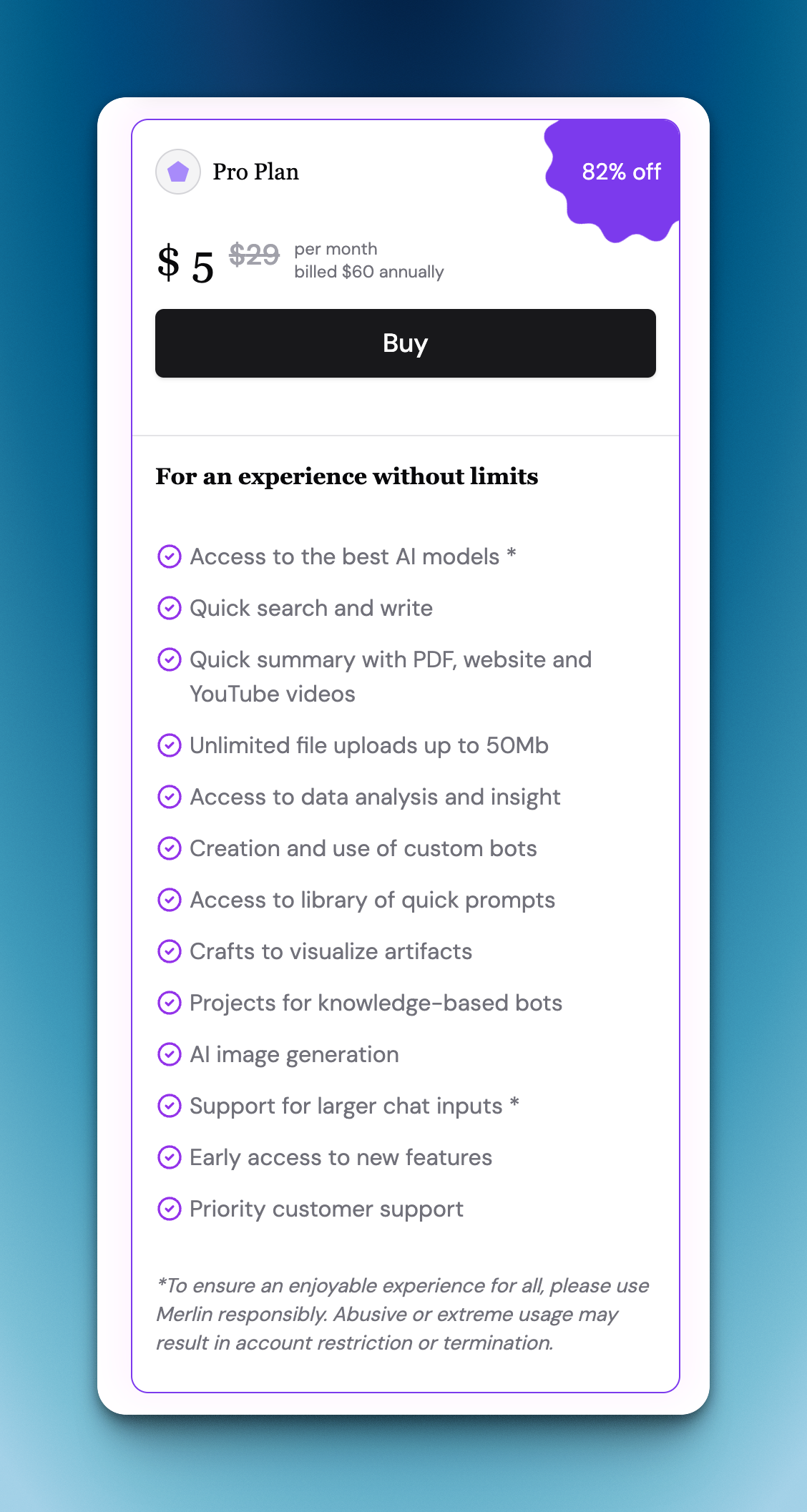Normalerweise kostet Merlin 19 US-Dollar pro Monat, aber aktuell gibt es ein Angebot, bei dem das Abonnement für nur 5 US-Dollar im Monat erhältlich ist. Für diesen Preis erhält man Zugriff auf eine beeindruckende Sammlung von KI-Modellen und Funktionen, die sonst nur über teure Einzelabonnements oder APIs verfügbar wären.